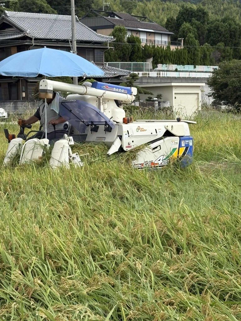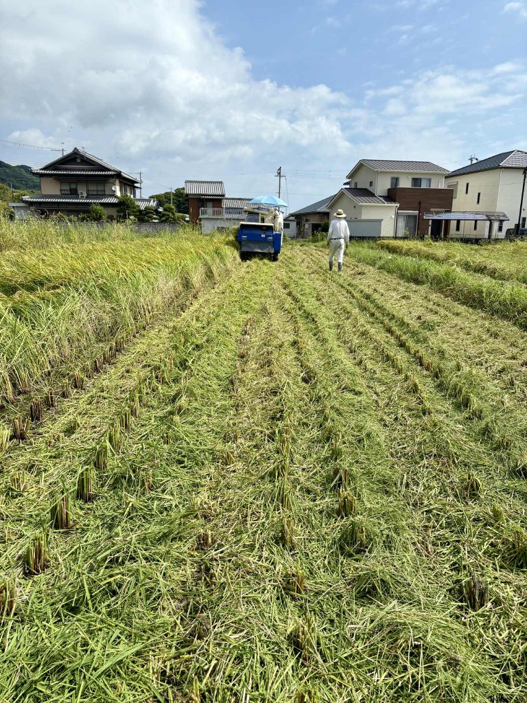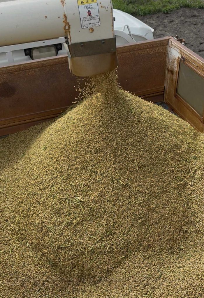 伺った時には、すでにコンバインが稲を刈り取りを始めていて、刈り取った稲穂は、コンバインの中で粒状になり、軽トラックへと積まれていく様子を眺めていました。