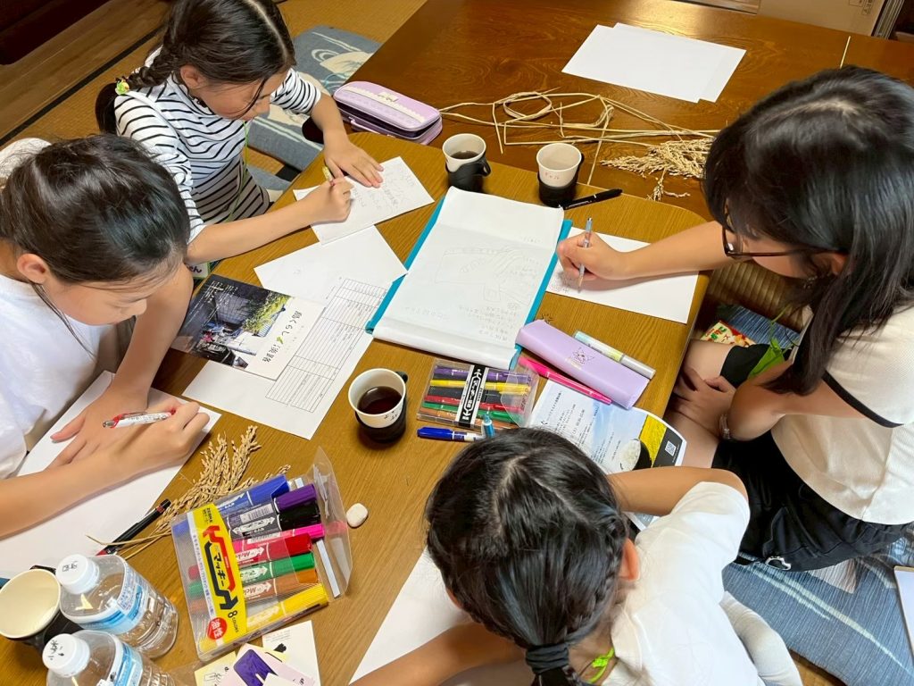 水路探索から帰ってきたあとは地域のイベントの準備を手伝ってもらいました。生穂の田主の皆様と一緒に田んぼを見学し、米作りの1年を学ぶイベントです。小学生のみなさんにはイベントで使用するしおりを作成していただきました。「喜んでもらえるかな?」「見やすいかな?」と話しながら真剣に取り組む姿に関心するばかりでした。最後はヘトヘトになりながらも、素敵なしおりを作りあげてくれました。