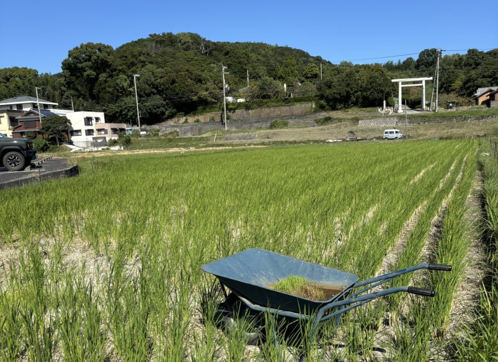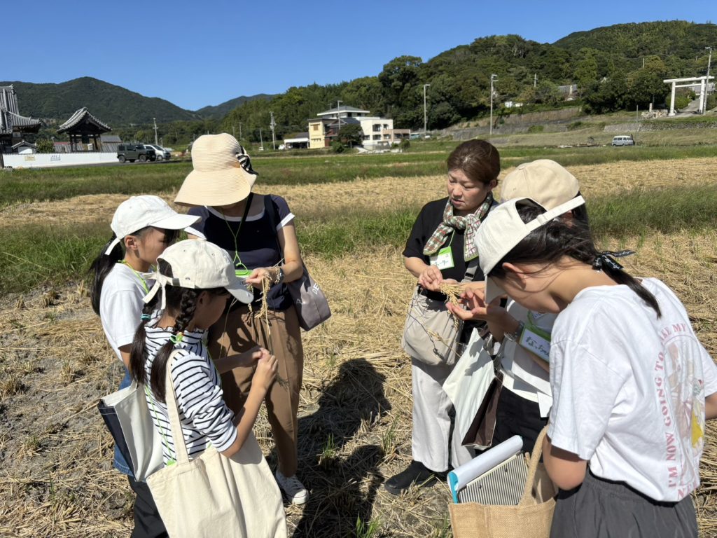 また、島くらし淡路から車で5分程のところにある生穂の田んぼの紹介を行いました。「田んぼだったところが放置されるとどうなる?」「米作りに必要なものは?」という質問を一緒に考えました。米作りに欠かせないものといえば沢山ありますが、その中でも特に大切なのが水。水を確保するためには水路が必要です。水路とは水を引き水を抜く道のことです。田んぼの出入口を塞いだり開けたりして、田んぼに水を入れることができます。