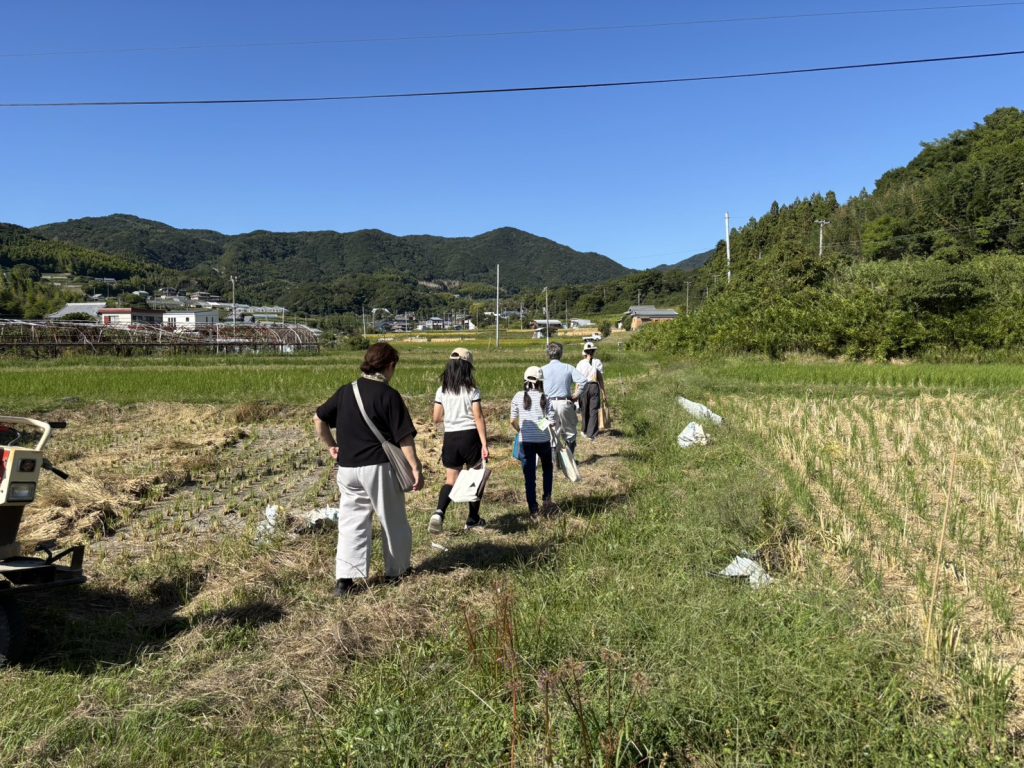 みんなでテーブルを囲んでお弁当を食べた後は実際に生穂の田んぼに行き、水路を歩いて探索しました。地図を見ながら生穂の田んぼから水源であるため池まで歩き、水路をたどります。細い道は一列になって、草が生えているところは草をかき分けながら進みました。10月と言えどまだまだ暑く、水路を往復する頃には汗でびっしょりになっていました。水路を歩く途中で偶然田主の方に会い、お話を伺うことができました。突然会ったにも関わらず丁寧に水路の説明をしていただき、ここでも淡路島に暮らす方のあたたかさを感じることができました。