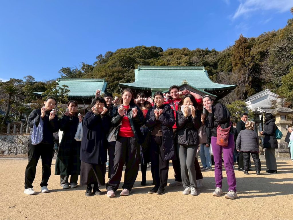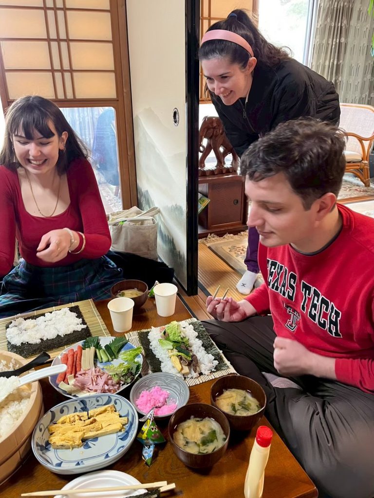 餅まきで体を沢山動かした後は、恵方巻作りをしました。恵方巻の「恵方」とは、陰陽道でその年の福徳を司る「歳徳神(としとくじん)」がいる方角のことです。この恵方は、縁起のいい方角とされています。(2026年の方角は南南東でした)恵方を向いて、恵方巻を一本まるごと切らずにそのまま食べることで「縁を切らない」「縁起をかつぐ」という意味があるそうです。また、途中で話すと体に入ってきた「福」が外に逃げてしまうと言われているため、話さずに食べきるというルールがあります。他にも様々なルールがあるようですが、今回のイベントではこの二つのルールで恵方巻を食べました。